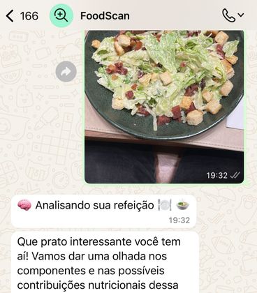 A IA do FoodScan analisa o alimento, calcula nutrientes, calorias e fornece recomendações práticas — tudo direto na conversa do WhatsApp e em poucos segundos!